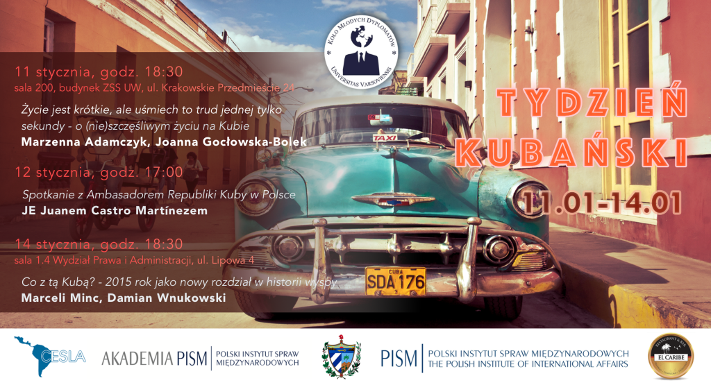 Koło Młodych Dyplomatów ma zaszczyt zaprosić na 1. edycję wyjątkowego wydarzenia, jakim jest Tydzień Kubański na Uniwersytecie Warszawskim. Organizowany jest pod patronatem Centrum Studiów Latynoamerykańskich UW, Polskiego Instytutu Spraw Międzynarodowych, Akademii PISM oraz przy współpracy restauracji El Caribe. Wydarzenie odbędzie się w dniach 11-14 stycznia 2016 r.